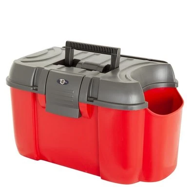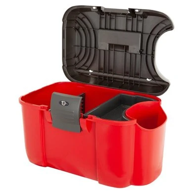 Deze poetskoffer is gemaakt om alles te weerstaan! De verstevigde deksel kan maar liefst 120 kilogram veilig houden waardoor de box gebruikt kan worden als krukje, opstapje of om op te zitten. De grote sluiting is duurzaam, gemakkelijk in het gebruik en zorgt ervoor dat de box in alle omstandigheden veilig gesloten blijft. De stevigheid en duurzaamheid zijn niet de enige eigenschappen die deze poetsbox onderscheidend maken, de box is in het gebruik ontzettend handig, overal is aan gedacht! In het ‘kangaroe vak’ aan de zijkant blijven zelfs de grootste flessen rechtop staan. De kan afgesloten worden met een slotje (niet bijgeleverd) en is aan de bovenzijde voorzien van een sleuf waarin een zweep geschoven kan worden. De binnenkant is voorzien van een verplaatsbaar tussenschot en een losse inzetbak voor alle kleine spullen. Als laatste toevoeging is de box voorzien van een dop voor een hoefkwast die in de linkerhoek rechtop vastgezet kan worden.