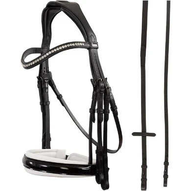Het kopstuk en de neusriem zijn beiden zacht onderlegd voor optimaal comfort en een goede drukverdeling. De neusriem bevat een vulling van 10 mm en is aan de buitenzijde bedekt met lakleder. De gun metal-gekleurde gespen zijn voorzien van een beschermflap op de plekken waar de gesp het paardenhoofd raakt. Het licht gebogen frondeel is stijlvol afgewerkt met glanzende imitatiediamanten van Stelluxâ„¢ in zilverkleurige cups. Inclusief lederen en rubberen teugel.