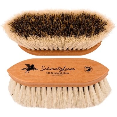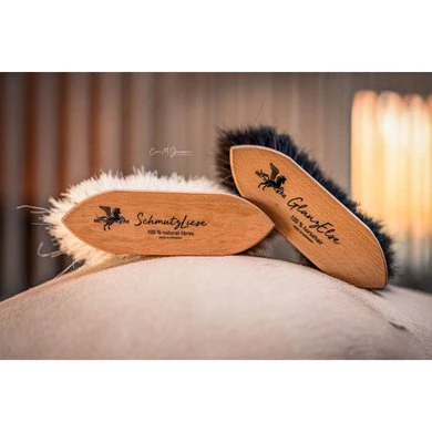 De harde natuurvezels van de SchmutzLiese verwijderen het grove vuil heel gemakkelijk – tegelijkertijd halen de buitenste zachte natuurvezels het grove stof uit de vacht. Voor lichaam en benen.