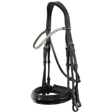 Dit symmetrische hoofdstel van hoogwaardig Europees leder heeft een E-Line kopstuk. Dit anatomisch gevormde kopstuk is zacht gevoerd en zorgt dankzij de ronde vorm voor extra vrijheid achter de oren van het paard. Het gebogen frondeel is voorzien van twee rijen grote kristallen van Swarovski®en onderlegd met zacht leder. De keelriem is verstelbaar met één gespsluiting aan de onderzijde. De gespsluiting is voorzien van een extra beschermflap. De bakstukken zijn vervaardigd van rondgenaaid leder en voorzien van blinde sluitingen. Het hoofdstel heeft een brede aansnoerneusriem (circa 5 cm) met lakleder en rondgenaaide riempjes. De neusriem is rond gebombeerd, zacht gevoerd en voorzien van een brede, zacht gevoerde kaakbeschermer. De neusriem is bovendien anatomisch gevormd. Het hoofdstel is voorzien van blinde sluitingen en ronde, glanzende, zilverkleurige fournituren. Exclusief teugels.