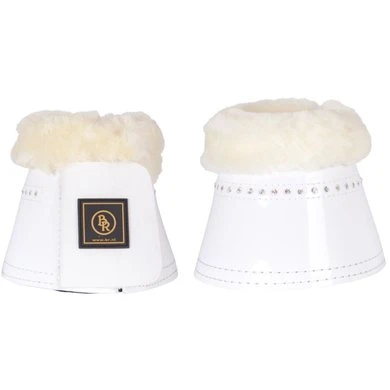 Springschoen van glanzend synthetisch lakleder voorzien van een randje imitatie diamanten en een extra zachte schapenvacht rand met een dikte van 16 mm. De springschoen heeft een 5.5 mm dikke neopreen voering en een brede, dubbele klittenbandsluiting. Springschoenen voorkomen dat het paard zichzelf verwondt door op de verzenen of op de achterkant van de ballen van de hoef te trappen.