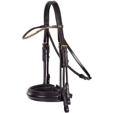 Symmetrisch hoofdstel met zacht gevoerd kopstuk. Het smalle, gebogen frondeel is voorzien van vierkante SWAROVSKI ELEMENTS en is met zacht leder onderlegd. De keelriem is verstelbaar met één gespsluiting aan de onderzijde. De extra brede aansnoerneusriem (circa 5 cm) is rond gebombeerd, zacht gevoerd en voorzien van een brede, zacht gevoerde kaakbeschermer. Neusriem, keelriem en bakstukken zijn van rondgenaaid leder. Het hoofdstel is voorzien van blinde sluitingen en ronde, glanzende fournituren. Exclusief teugels.