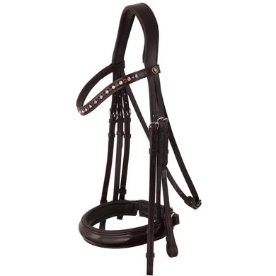 Symmetrisch hoofdstel met anatomisch gevormd kopstuk. Het kopstuk is heerlijk zacht gevoerd. De keelriem is verstelbaar met één gespsluiting aan de onderzijde. Het gebogen frondeel met lakleder is ingelegd met SWAROVSKI ELEMENTS en onderlegd met zacht leder. De extra brede aansnoerneusriem (circa 4.5 cm) met lakleder is rond gebombeerd, zacht gevoerd en voorzien van een brede, zacht gevoerde kaakbeschermer. Het hoofdstel is voorzien van blinde sluitingen en ronde, glanzende, zilverkleurige fournituren. Exclusief teugels.