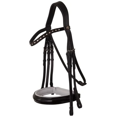 Symmetrisch hoofdstel met anatomisch gevormd kopstuk. Het kopstuk is heerlijk zacht gevoerd. De keelriem is verstelbaar met één gespsluiting aan de onderzijde. Het gebogen frondeel met lakleder is ingelegd met SWAROVSKI ELEMENTS en onderlegd met zacht leder. De extra brede aansnoerneusriem (circa 4.5 cm) met lakleder is rond gebombeerd, zacht gevoerd en voorzien van een brede, zacht gevoerde kaakbeschermer. Het hoofdstel is voorzien van blinde sluitingen en ronde, glanzende, zilverkleurige fournituren. Exclusief teugels.