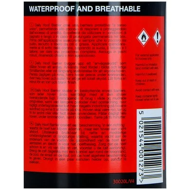 Daily Hoof Barrier creëert een bescherming ‘in één richting’, waarbij de hoef kan blijven ademen, maar het teveel aan vocht wordt afgestoten. Uitstekend te gebruiken bij natte en modderige omstandigheden of langdurige stalling, waarbij vocht aan de onderkant van de hoeven de gezondheid van de hoef kan aantasten en slecht is voor het hoefbeslag. Eenvoudig aan te brengen met de bijgeleverde kwast.