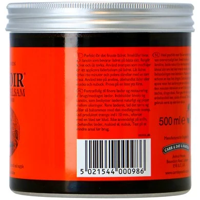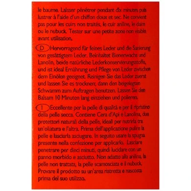 Voedt en verzorgt, ideaal voor nieuw en fijn leder. Dringt tot diep in het leder door en houdt het leer in een perfecte conditie. De zachte balsem is makkelijk in gebruik en trekt snel in. Bevat onder andere wolvet en bijenwas. Inhoud 500 ml.