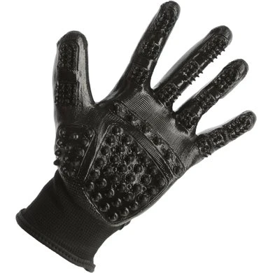 Handschoen en eg in één • met verschillende maten knoppen om het paard te masseren en haren te verwijderen bij het wisselen van vacht • nauw contact met het paard is mogelijk, waardoor het ideaal is voor gebruik op gevoelige of moeilijk bereikbare plaatsen • veilige pasvorm dankzij polsbevestiging met klittenbandsluiting • gebreid polyester met coating synthetisch rubber en PVC • in paren