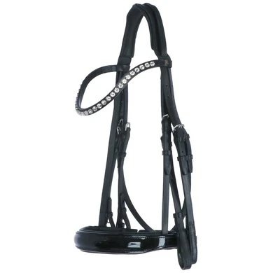 Stang en trens hoofdstel, onderlegd kopstuk, blinde sluitingen, brede aansnoerneusriem met lak, frontriem gebogen met Swarovski Elements