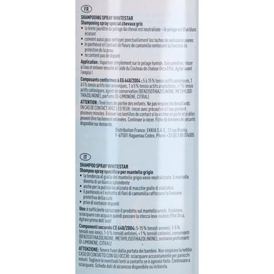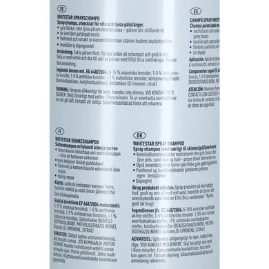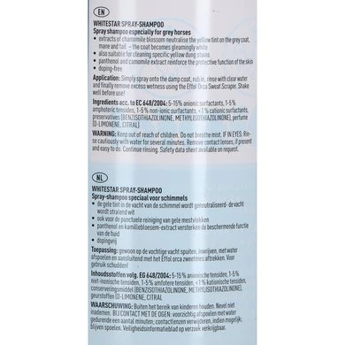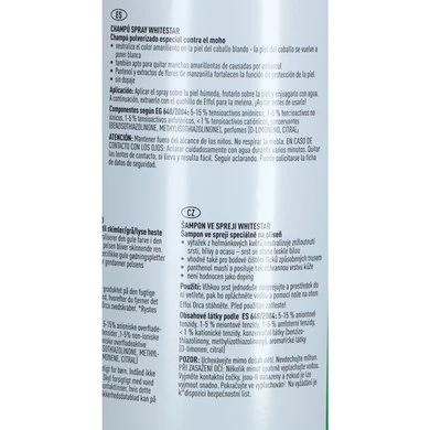 Spray-shampoo speciaal voor schimmels. De gele tint in de vacht van de schimmel wordt geneutraliseerd- de vacht wordt stralend wit. Ook voor de punctuele reiniging van gele mestvlekken. Panthenol en kamillebloesem-extract versterken de beschermende functie van de huid. Dopingvrij.