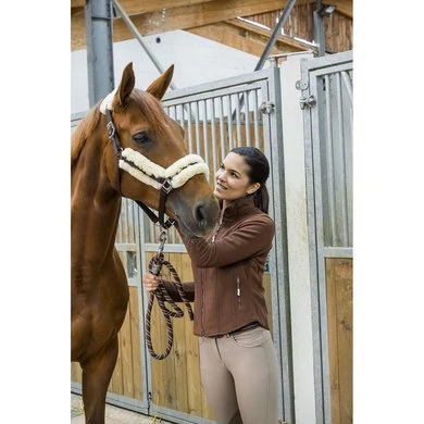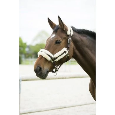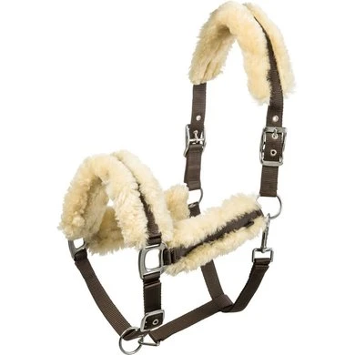 Van zeer zachte dubbeldik polypropyleen met het kopstuk, de bakstukken en neusriem gevoerd met synthetisch schapenvacht. Kopstuk is dubbel verstelbaar met gespen en versterkte oogjes. Keelriem met snelsluiting. Solide vernikkelde metalen gespen.