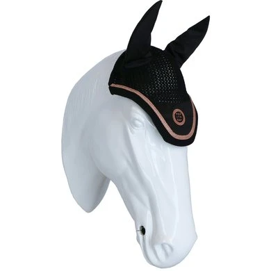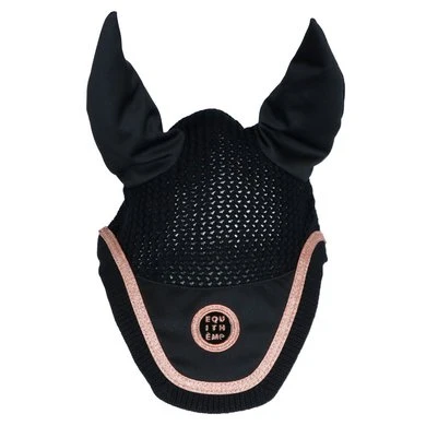 Oornetje van gehaakt katoen, inzet met logo in polyester en oorstukjes in elastische polyester stof. Afgezet met dun koord.