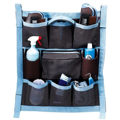 Zo heeft u alle verzorgingsproducten altijd binnen handbereik. Makkelijk te bevestigen aan de tralies van de staldeur of ergens aan de muur doormiddel van klittenbandlussen. Nylon verstevigingen met 6 grote zakken van maasstof om borstels, bandages of andere accessoires in op te bergen, een vakje met ritssluiting en twee voorgevormde, opgevulde zakken voor flessen (zoals lotion, shampoo ).