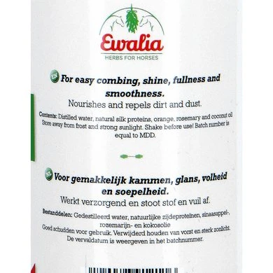 Voor gemakkelijk kammen, glans, volheid en soepelheid. Werkt verzorgend en stoot stof en vuil af. De staart en manen-spray voedt met waardevolle sinaasappel-, rozemarijn- en kokosolie. Daarnaast zorgen natuurlijke zijdeproteïnen voor de glans, volheid en soepelheid van het paardenhaar. Stro of zaagsel worden gemakkelijk van staart en manen geborsteld zonder haar te breken of uit te trekken. Ook geschikt voor gevoelige paarden.