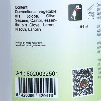 F.N.A.® hoof hard versterkende hoefverzorgingsolie is een vloeibare formule afgeleid van een complex van plantaardige oliën en extreem rijke natuurlijke producten.Vooral te gebruiken op brokkel hoeven en gebroken hoorn. De componenten ervan werken voornamelijk om de hoorn te verharden terwijl deze blijft ademen. Het herstelt de flexibiliteit van de hoorn en versterkt de hoef. Het draagt bij aan een gezonde groei van de hoef. Eigenschappen: verhardt en versterkt de hoef. Gebruiksaanwijzing: Goed schudden voor gebruik. Dagelijks met de kwast aanbrengen. Samenstelling: Plantaardige oliën (Kokosnoot, Olijfolie, Sesamolie, Ricinusolie). Rijk aan meervoudig onverzadigde vetzuren + vitamine A en E. Etherische oliën: Kruidnagel, Citroen, Niaouli. Ander natuurlijk product: Lanoline.