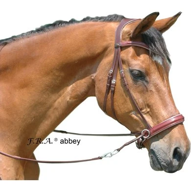 F.R.A. bitloos systeem 5: bitloze optomingen zijn niet nieuw! Eeuwenlang werd een bitloze optoming als vanzelfsprekend ervaren, voordat er ooit aan werd gedacht iets in de mond van het paard te stoppen legde de mens er simpelweg iets omheen. Een touw als halster was destijds voldoende en zo ontstond de eerste bitloze optoming. In combinatie met de ondersteunende gewichts-,been- en gevoelshulpen onderhoudt de ruiterhand via de teugels kontakt, niet met de mond, maar met het hoofd van het paard. Werkingsprincipe: druk op neus, nek èn wangen, nek/kingekruiste teugelvoering. Bouw: De lederen neusriem van deze optomingen, in de markt veelal bekend onder systeem Cook, is aan beide zijden even achter de bakstukken voorzien van een ring. Door deze ringen loopt een soepele lederen riem kruislings over de kin, via de kaken over de nek. Aan beide uiteinden van deze riem worden de gespen of clips van de teugeluiteinden bevestigd. Aan de linkerzijde van het hoofdstel vind je één gesp voor de bakstukafstelling en één gesp voor het verbinden van de kruislingse riemen. Ter bescherming van het nekgebied zijn beide riemen daar met een zachte padding onderlegd. De riemen dienen zodanig door de passanten van deze nekpadding verschoven te worden dat ze aan beide zijden gelijke lengte hebben. De gesp van de kinriem is de enige gesp die nodig is om het hooofdstel op het hoofd te fixeren. Ligging: Evenals bij de meeste bitloze optomingen geldt ook voor deze optomingen dat de neusriem op het harde gedeelte van de neus moet liggen, ongeveer daar waar het neusbeen begint. De kinriem mag gevoelsmatig ’te’ vast, maar beslist niet aangesnoerd zijn. Dit om verdraaiïng van het hoofdstel te voorkomen. De bakstukken van bitloze hoofdstellen met een kin- nekgekruist systeem zullen altijd de neiging hebben enigszins op te bollen. Inwerking: