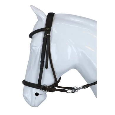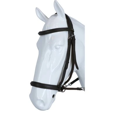 F.R.A. bitloos systeem 5: bitloze optomingen zijn niet nieuw! Eeuwenlang werd een bitloze optoming als vanzelfsprekend ervaren, voordat er ooit aan werd gedacht iets in de mond van het paard te stoppen legde de mens er simpelweg iets omheen. Een touw als halster was destijds voldoende en zo ontstond de eerste bitloze optoming. In combinatie met de ondersteunende gewichts-,been- en gevoelshulpen onderhoudt de ruiterhand via de teugels kontakt, niet met de mond, maar met het hoofd van het paard. Werkingsprincipe: druk op neus, nek èn wangen, nek/kingekruiste teugelvoering. Bouw: De lederen neusriem van deze optomingen, in de markt veelal bekend onder systeem Cook, is aan beide zijden even achter de bakstukken voorzien van een ring. Door deze ringen loopt een soepele lederen riem kruislings over de kin, via de kaken over de nek. Aan beide uiteinden van deze riem worden de gespen of clips van de teugeluiteinden bevestigd. Aan de linkerzijde van het hoofdstel vind je één gesp voor de bakstukafstelling en één gesp voor het verbinden van de kruislingse riemen. Ter bescherming van het nekgebied zijn beide riemen daar met een zachte padding onderlegd. De riemen dienen zodanig door de passanten van deze nekpadding verschoven te worden dat ze aan beide zijden gelijke lengte hebben. De gesp van de kinriem is de enige gesp die nodig is om het hooofdstel op het hoofd te fixeren. Ligging: Evenals bij de meeste bitloze optomingen geldt ook voor deze optomingen dat de neusriem op het harde gedeelte van de neus moet liggen, ongeveer daar waar het neusbeen begint. De kinriem mag gevoelsmatig ’te’ vast, maar beslist niet aangesnoerd zijn. Dit om verdraaiïng van het hoofdstel te voorkomen. De bakstukken van bitloze hoofdstellen met een kin- nekgekruist systeem zullen altijd de neiging hebben enigszins op te bollen. Inwerking: