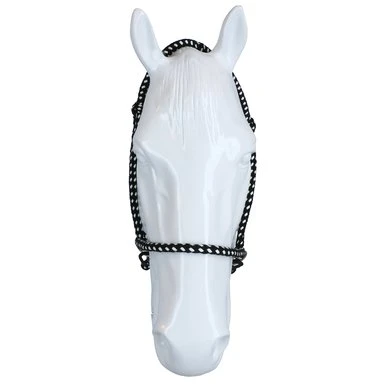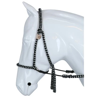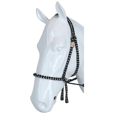 F.R.A. bitloos systeem 4: bitloze optomingen zijn niet nieuw! Eeuwenlang werd een bitloze optoming als vanzelfsprekend ervaren, voordat er ooit aan werd gedacht iets in de mond van het paard te stoppen legde de mens er simpelweg iets omheen. Een touw als halster was destijds voldoende en zo ontstond de eerste bitloze optoming. In combinatie met de ondersteunende gewichts-,been- en gevoelshulpen onderhoudt de ruiterhand via de teugels kontakt, niet met de mond, maar met het hoofd van het paard. Werkingsprincipe: druk op neus en wangen, kingekruiste teugelvoering. Bouw: In dit systeem eindigt de neusriem aan beide zijden met een ring waaraan de bakstukken en de beide kinkruisriemen zijn bevestigd. Deze riemen vinden hun kruisgeleiding door een ring aan het einde van een kort stukje leder dat op zich dan weer aan de ringen van de neusriem is bevestigd. Gevolg is dat het kruislingse geheel wat lager hangt dan bij kaakgekruiste optomingen (zie systeem 5). Aan de uiteinden van de kruisriemen worden de teugels bevestigd. Verder is dit hoofdstel eenvoudig in uitvoering door het ontbreken van een frontriem, een keelriem en de stoot en gesp die we normaal op een neusriem aantreffen. Aan de linkerzijde vind je een gespverbinding in het bakstuk, het is de enige gesp, die nodig is om het hoofdstel op maat te maken. Éénmaal op maat, dan schuif je het hoofdstel van dit systeem simpelweg op het paardenhoofd waarna je niets meer hoeft vast te maken. Voor de serie F.R.A.® katoenen hoofdstelen uit systeem 4 geldt in essentie het hier beschrevene, uiteraard is er in die lijn van hoofdstellen geen sprake van gespverbindingen of andere op leder betrekking hebbende omschrijvingen. Ligging: Evenals bij de meeste bitloze optomingen geldt ook voor de hoofdstellen uit systeem 4, dat de neusriem op het harde gedeelte van de neus moet liggen, ongeveer daar waar het neusbeen begint. De bijzondere bouw van deze hoofdstellen zorgen voor een goede en vaste ligging op het paardenhoofd zonder dat je iets behoeft vast te maken. Inwerking: De kingekruiste riemen zorgen ervoor dat wanneer je links of rechts vraagt, het paard druk aan de andere kant op neus en wang krijgt en vervolgens de hand van de ruiter volgt: wendingen dus als gevolg van druk. Gelijktijdige ophoudingen aan beide teugels sluiten de neusriem en geven mogelijkheden tot halthouden of tempowisselingen. Het genoemde vragen van linker, rechter of beide teugels zal door de indirecte teugelvoering altijd een bepaalde mate van dosering in zich hebben, het is deze dosering die de mate van discriminerende inwerking bepaald. Dit heeft tot gevolg dat een gewenste wijziging in de mate van discriminatie altijd in een vloeiend effect tot stand zal komen. Vanzelfsprekend worden teugelhulpen ondersteund met overige ondersteunende hulpen. Het verbindigsriempje dat de teugelgeleidering aan de neusriem en het bakstuk verbindt zorgt voor een lage ligging en vrije doorvoer van de kruislingse kinkruisriemen hetgeen de release zeer ten goede komt. Extra aandacht bij dit type hoofdstellen zal altijd moeten worden gegeven aan het onderhoud van de gekruiste kinriemen, het juiste onderhoud zal het leder de soepelheid geven om in de ringen de juiste release blijvend te kunnen ondervinden. Het hoofdstel leent zich niet tot longeren met de enkele longe en daardoor dus ook niet tot pessoa longeren. Voor het longeren aan de dubbele lijnen neemt u de teugels af en gebruikt u de vrijkomende ringen voor het bevestigen van de lange lijnen. Geschiktheid: De optoming wordt in combinatie met licht teugelcontact gebruikt en is zeer geschikt voor gevoelige paarden. Daardoor leent de optoming zich ook in het bijzonder voor in te rijden jonge paarden en hoog in het bloed staande gevoelige dieren, in die categorie is het hoofdstel ook als menhoofdstel te gebruiken. Naast dat het hoofdstel als leidhalster te gebruiken is geeft het tevens volledige mondvrijheid hetgeen op buitenritten zijn voordeel kan bieden.