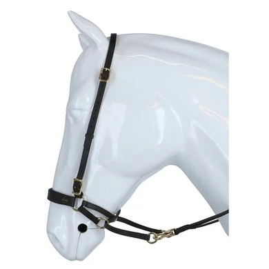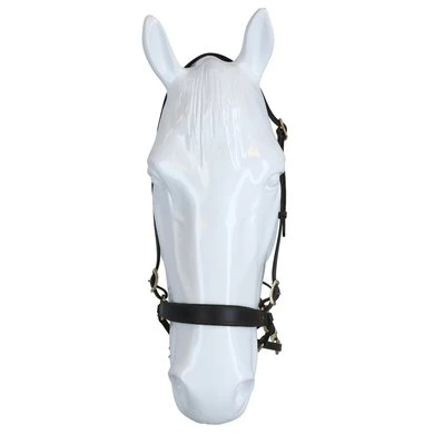 F.R.A. bitloos systeem 4: bitloze optomingen zijn niet nieuw! Eeuwenlang werd een bitloze optoming als vanzelfsprekend ervaren, voordat er ooit aan werd gedacht iets in de mond van het paard te stoppen legde de mens er simpelweg iets omheen. Een touw als halster was destijds voldoende en zo ontstond de eerste bitloze optoming. In combinatie met de ondersteunende gewichts-,been- en gevoelshulpen onderhoudt de ruiterhand via de teugels kontakt, niet met de mond, maar met het hoofd van het paard. Werkingsprincipe: druk op neus en wangen, kingekruiste teugelvoering. Bouw: In dit systeem eindigt de neusriem aan beide zijden met een ring waaraan de bakstukken en de beide kinkruisriemen zijn bevestigd. Deze riemen vinden hun kruisgeleiding door een ring aan het einde van een kort stukje leder dat op zich dan weer aan de ringen van de neusriem is bevestigd. Gevolg is dat het kruislingse geheel wat lager hangt dan bij kaakgekruiste optomingen (zie systeem 5). Aan de uiteinden van de kruisriemen worden de teugels bevestigd. Verder is dit hoofdstel eenvoudig in uitvoering door het ontbreken van een frontriem, een keelriem en de stoot en gesp die we normaal op een neusriem aantreffen. Aan de linkerzijde vind je een gespverbinding in het bakstuk, het is de enige gesp, die nodig is om het hoofdstel op maat te maken. Éénmaal op maat, dan schuif je het hoofdstel van dit systeem simpelweg op het paardenhoofd waarna je niets meer hoeft vast te maken. Voor de serie F.R.A.® katoenen hoofdstelen uit systeem 4 geldt in essentie het hier beschrevene, uiteraard is er in die lijn van hoofdstellen geen sprake van gespverbindingen of andere op leder betrekking hebbende omschrijvingen. Ligging: Evenals bij de meeste bitloze optomingen geldt ook voor de hoofdstellen uit systeem 4, dat de neusriem op het harde gedeelte van de neus moet liggen, ongeveer daar waar het neusbeen begint. De bijzondere bouw van deze hoofdstellen zorgen voor een goede en vaste ligging op het paardenhoofd zonder dat je iets behoeft vast te maken. Inwerking: De kingekruiste riemen zorgen ervoor dat wanneer je links of rechts vraagt, het paard druk aan de andere kant op neus en wang krijgt en vervolgens de hand van de ruiter volgt: wendingen dus als gevolg van druk. Gelijktijdige ophoudingen aan beide teugels sluiten de neusriem en geven mogelijkheden tot halthouden of tempowisselingen. Het genoemde vragen van linker, rechter of beide teugels zal door de indirecte teugelvoering altijd een bepaalde mate van dosering in zich hebben, het is deze dosering die de mate van discriminerende inwerking bepaald. Dit heeft tot gevolg dat een gewenste wijziging in de mate van discriminatie altijd in een vloeiend effect tot stand zal komen. Vanzelfsprekend worden teugelhulpen ondersteund met overige ondersteunende hulpen. Het verbindigsriempje dat de teugelgeleidering aan de neusriem en het bakstuk verbindt zorgt voor een lage ligging en vrije doorvoer van de kruislingse kinkruisriemen hetgeen de release zeer ten goede komt. Extra aandacht bij dit type hoofdstellen zal altijd moeten worden gegeven aan het onderhoud van de gekruiste kinriemen, het juiste onderhoud zal het leder de soepelheid geven om in de ringen de juiste release blijvend te kunnen ondervinden. Het hoofdstel leent zich niet tot longeren met de enkele longe en daardoor dus ook niet tot pessoa longeren. Voor het longeren aan de dubbele lijnen neemt u de teugels af en gebruikt u de vrijkomende ringen voor het bevestigen van de lange lijnen. Geschiktheid: De optoming wordt in combinatie met licht teugelcontact gebruikt en is zeer geschikt voor gevoelige paarden. Daardoor leent de optoming zich ook in het bijzonder voor in te rijden jonge paarden en hoog in het bloed staande gevoelige dieren, in die categorie is het hoofdstel ook als menhoofdstel te gebruiken. Naast dat het hoofdstel als leidhalster te gebruiken is geeft het tevens volledige mondvrijheid hetgeen op buitenritten zijn voordeel kan bieden.