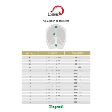 F.R.A.® Cavallo … de méést simpele hoefschoen ter wereld! Kenmerken: één simpele, meervoudige klittebandsluiting aan de voorzijde / de schoen laat zich daardoor in één beweging aan- en afdoen / de schoen is daardoor zeer stevig aan de hoef verbonden / gevormd naar de anatomie van de onbeslagen natuurlijke hoef / een verhoogde binnenrand draagt de onderrand van de hoef en maakt de zool vrij van druk / de anatomisch voorgevormde achterzijde beschermt de hoefballen / de echt lederen opbouw is zacht en komfortabel / de opbouw is aan de bovenzijde afgewerkt met een schuimgevulde zacht lederen kraag . De hoefschoen is opgebouwd uit duurzame materialen: 1e kwaliteit leder,waterproof stiksel, roestvrijstalen klitteband geleiders,de zool zelf is vervaardigd uit het kwalitatief zeer hoogwaardige materiaal thermo plastic urethane (TPU). Ingebouwde drainage sleuven voorkomen het vastzuigen in modderige plaatsen, de hoefschoen is licht van gewicht en schokabsorberend. Tevens bevordert de hoefschoen de groei van gezonde hoeven: het ongestoord funktioneren van het hoefmechanisme heeft een optimale bloedcirculatie tot gevolg. De schoen is wereldwijd gepatenteerd onder nummer US 553,806S.Verkrijgbaar in 7 maten, handig te bepalen aan de hand van de beschikbaar gestelde maattabel.