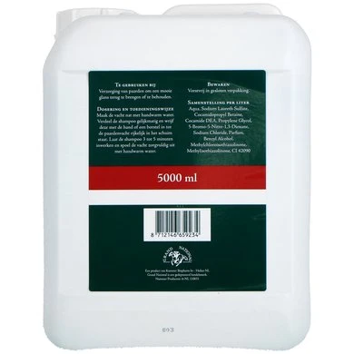 Deze lichtblauwe shampoo is biologisch afbreekbaar en zuinig in het gebruik. Grand National Equipe shampoo reinigt, maar houdt de natuurlijke vetten in stand en zorgt voor een optimale glans en doorkambaarheid. Verpakt in een grote 5 liter verpakking.