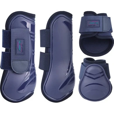 Beenbeschermerset bestaande uit peesbeschermers en strijklappen, klittenband sluiting en zachte en ademende voering. Optimale schokdemping en bescherming