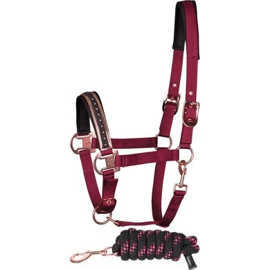 Halster met halstertouw. Het neusstuk is gedecoreerd met kristallen en is net als het kopstuk onderlegd met neopreen. Verstelbaar aan beide kanten van het kopstuk en aan de kaak. De gaatjes zijn voorzien van oogjes.