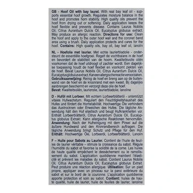 Hoefolie met vaseline en natuurlijke laurierolie. Stimuleert de hoefgroei en maakt het hoorn soepel. Om droge en brokkelige hoeven te verzorgen. Zeer efficiënt in gebruik. Ingredients: High-quality paraffinic solvent, Vaseline and laurel leaf oil.