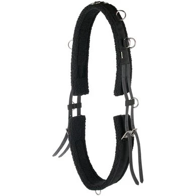 Longeersingel met bont/fleece voering. Zilverkleurige fournituren en kunstlederen stoten. Aan beide zijden te verstellen d.m.v. gespen. De longeersingel is voorzien van 11 ringen waarvan 1 ring aan de onderkant. Verstelbaarheid van de maten: Cob: omvang van 147 tot 203cm Full : omvang van 173 tot 230cm