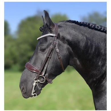 Dit stang en trens hoofdstel is uitgevoerd in special soft leder, met ss fournituren met blinde sluitingen aan bakstukken en teugels. Het kopstuk is zacht gevoerd en terug gesneden. Met anatomische lak neusriem 4cm breed en white glitter stone frontriem.