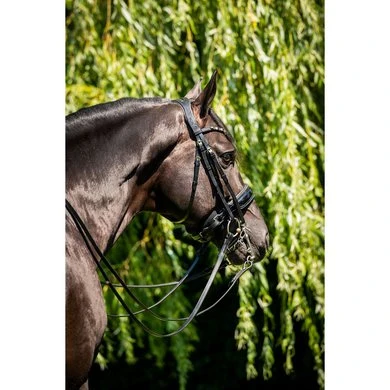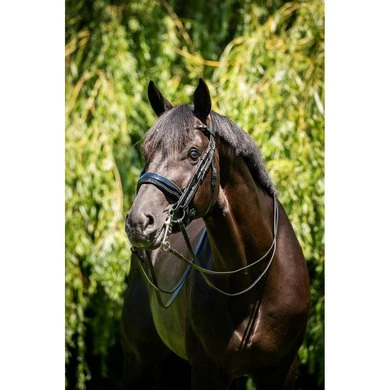 Dit stang en trens hoofdstel is speciaal ontwikkeld met een anatomisch zacht onderlegd en terug gesneden kopstuk. Dit kopstuk is zo gevormd om de druk achter de oren en op het hoofd te verlagen. De neusriem is nog beter anatomisch gevormd hierdoor is de pasvorm nog beter, en verlaagd de druk op de neus. De frontriem is speciaal vervaardigd met grote swarofski stenen. De neusriem is versiert met siersteentjes. Wordt geleverd met 2 lederen teugels.