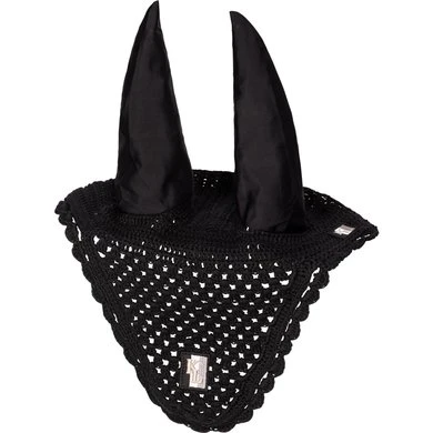 Katoenen gehaakte vliegenmuts met elastische oren. Geborduurde corporate patch vooraan en corporate patch aan één kant.