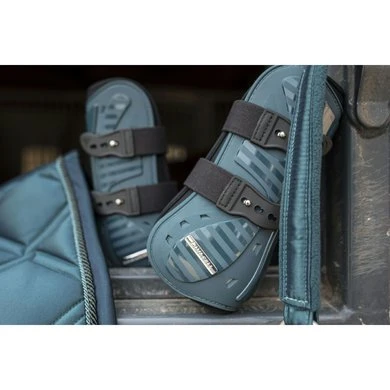 Peesbeschermerset Aurora. PU buitenzijde met neopreen voering. Peesbeschermers met snelsluiting en strijklappen met velcro sluiting afgewerkt met satijnen bies.