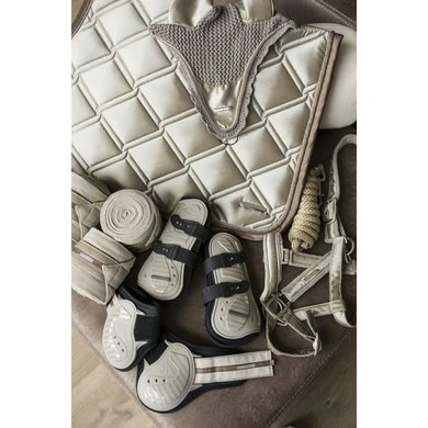 Peesbeschermerset Aurora. PU buitenzijde met neopreen voering. Peesbeschermers met snelsluiting en strijklappen met velcro sluiting afgewerkt met satijnen bies.