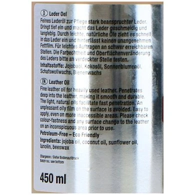 Voor de verzorging van intensief gebruikt leer. Fijne lederolie voor de verzorging van intensief gebruikt leer. Dringt diep in en maakt het leer soepel en verlengt de levensduur. Door lichte, natuurlijke olien trekt het snel in het leer en laat geen onaangename vetlaat achter. Voor makkelijk aanbrengen op moeilijk bereikbare plekken. Petroleumvrij – Eco Friendly