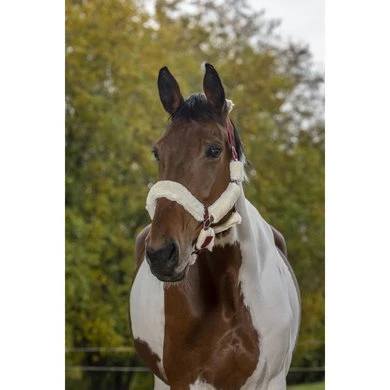 Verstelbaar halster van polypropyleen met snelsluiting, volledig bedekt met synthetische schapenvacht, afneembaar door klittenband.