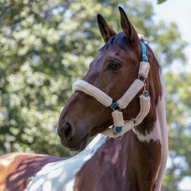 Verstelbaar halster van polypropyleen met snelsluiting, volledig bedekt met synthetische schapenvacht, afneembaar door klittenband.