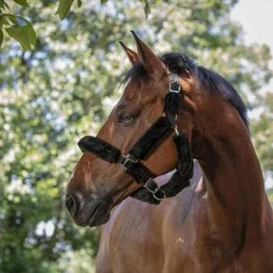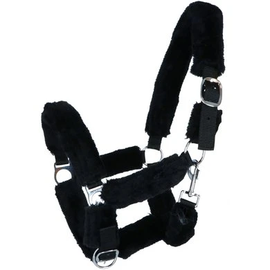 Verstelbaar halster van polypropyleen met snelsluiting, volledig bedekt met synthetische schapenvacht, afneembaar door klittenband.