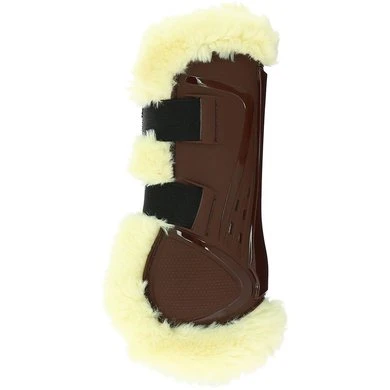Open peesbeschermers met geventileerde polyurethaan schaal gevoerd met synthetisch schapenvacht van 50% acryl en 50% polyester. Sluit met klittenband.