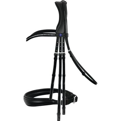 Het PASSIERBLU Dream Double Bridle maakt deel uit van de PASSIERBLU Collection en een droom die uitkomt! Het anatomisch gevormde, extra zachte kopstuk zorgt voor een optimale drukverdeling op de nek van het paard, de paardvriendelijke Passier Caveson Special is eveneens anatomisch gevormd en zacht gevoerd. De golvende frontriem wordt geleverd met middelgrote Premium Crystals in Clear Crystal, met een schitterende schittering die perfect past bij de roestvrijstalen fittingen of in Colorado Topaz, met een gouden gloed die er prachtig uitziet in combinatie met messing fittingen. Alleen origineel met het originele PASSIERBLU label aan de zijkant van de frontriem.
