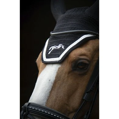 Oornetje met elastische oren. Pénélope-logo passend bij de kleur van de Point Sellier bies. Brede snit achter de oren om een anatomisch hoofdstel te kunnen plaatsen. Vierkante vorm aan de voorkant.