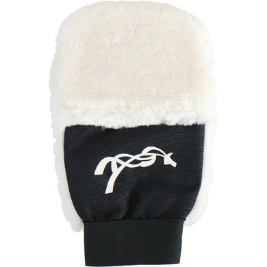 Off-white poetshandschoen van synthetische schapenvacht met wit logo op zwarte achtergrond. Gebruik om de vacht van het paard glanzend te maken. Elastische manchet. Natuurlijke kleur synthetische schapenvacht.Afmetingen: 23 x 15 cmSamenstelling: 82% polyester + 18% elastaanMachinewasbaar op 30 °C. Niet in de droger.