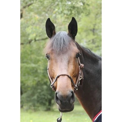 Halster van leer en touw. Verstelbare neusriem. Knoopbevestiging aan de zijkant van het hoofd. Glijring voor halstertouw. 2 leren delen op de neusriem. Geen band tussen neus- en keelriem om de druk achter de oren te verminderen. Muskaton aan de keelriem.