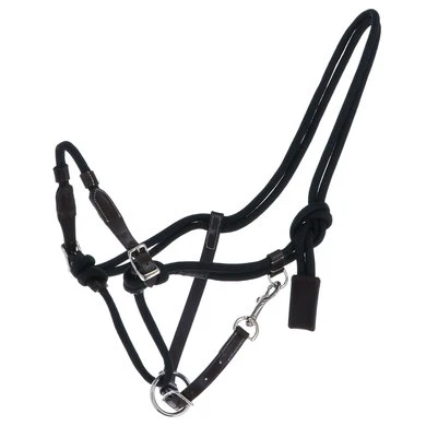 Halster van leer en touw. Verstelbare neusriem. Knoopbevestiging aan de zijkant van het hoofd. Glijring voor halstertouw. 2 leren delen op de neusriem. Geen band tussen neus- en keelriem om de druk achter de oren te verminderen. Muskaton aan de keelriem.