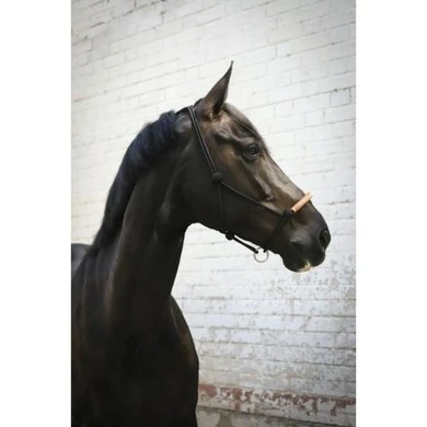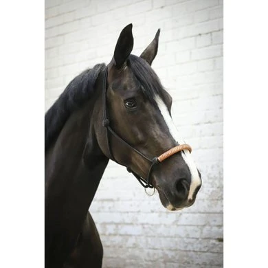 Touwhalster met extra vulling op het gedeelte van de neusriem. Verstelbaar dankzij een knoop. Zilverstalen ring voor de longe.